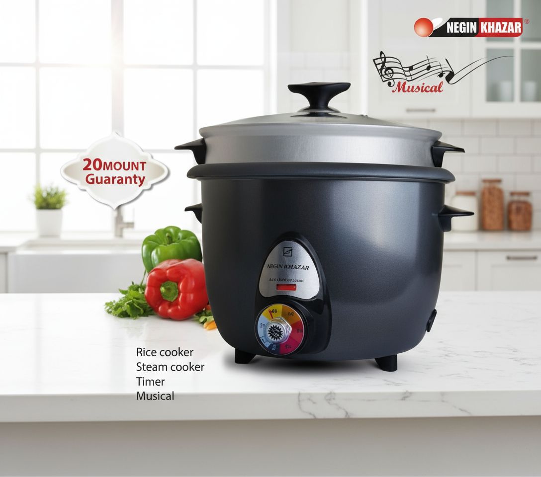 پلوپز بخارپز کیک پز سه کاره 12 نفره تایمردار موزیکال نگین خزر با گارانتی کتبی شرکتی
