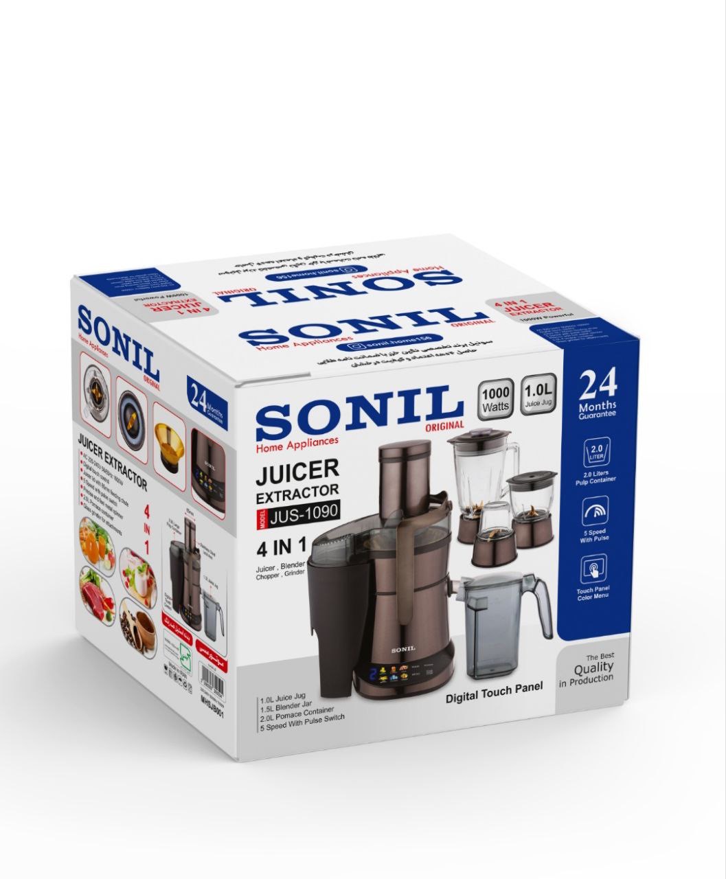 آبمیوهگیری سونیِل مدل JUS-1090 یک دستگاه چندکاره (۴ در ۱) شامل آبمیوهگیری، مخلوطکن، خردکن و آسیاب است. این محصول با توان 1000 وات، کنترل لمسی دیجیتال و طراحی مدرن، یک گزینهی کامل برای تهیه انواع نوشیدنیها و غذاهای خانگی محسوب میشود.