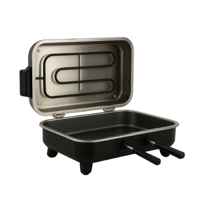 یک دستگاه خانگی-نیمهحرفهای است که با طراحی برقی و چندکاره شما را از دردسر ذغال و دود خلاص میکند. این محصول مناسب پخت انواع گوشت، مرغ، ماهی و سبزیجات است و برای مهمانیهای خانگی و فضاهای کوچک مثل کترینگهای سبک مناسب میباشد. بدنهٔ فولادی/استیل آن دوام و مقاومت دارد، سینی جمعآوری چربی پخت سالمتری ارائه میدهد، و صفحات یا سطح گریل نچسب، تمیزکاری را ساده میکنند. چرا این دستگاه برای شما مفید است؟ راحت و کمدود: بدون نیاز به زغال یا گاز میتوانید کباب و گریل حرفهای داشته باشید. پخت سالمتر: چربی اضافی در سینی جمعآوری میشود. تمیزکاری آسان: سطح نچسب و اجزای جداشونده. مناسب پذیرایی: طراحی شیک برای سرو در میز مهمانی.